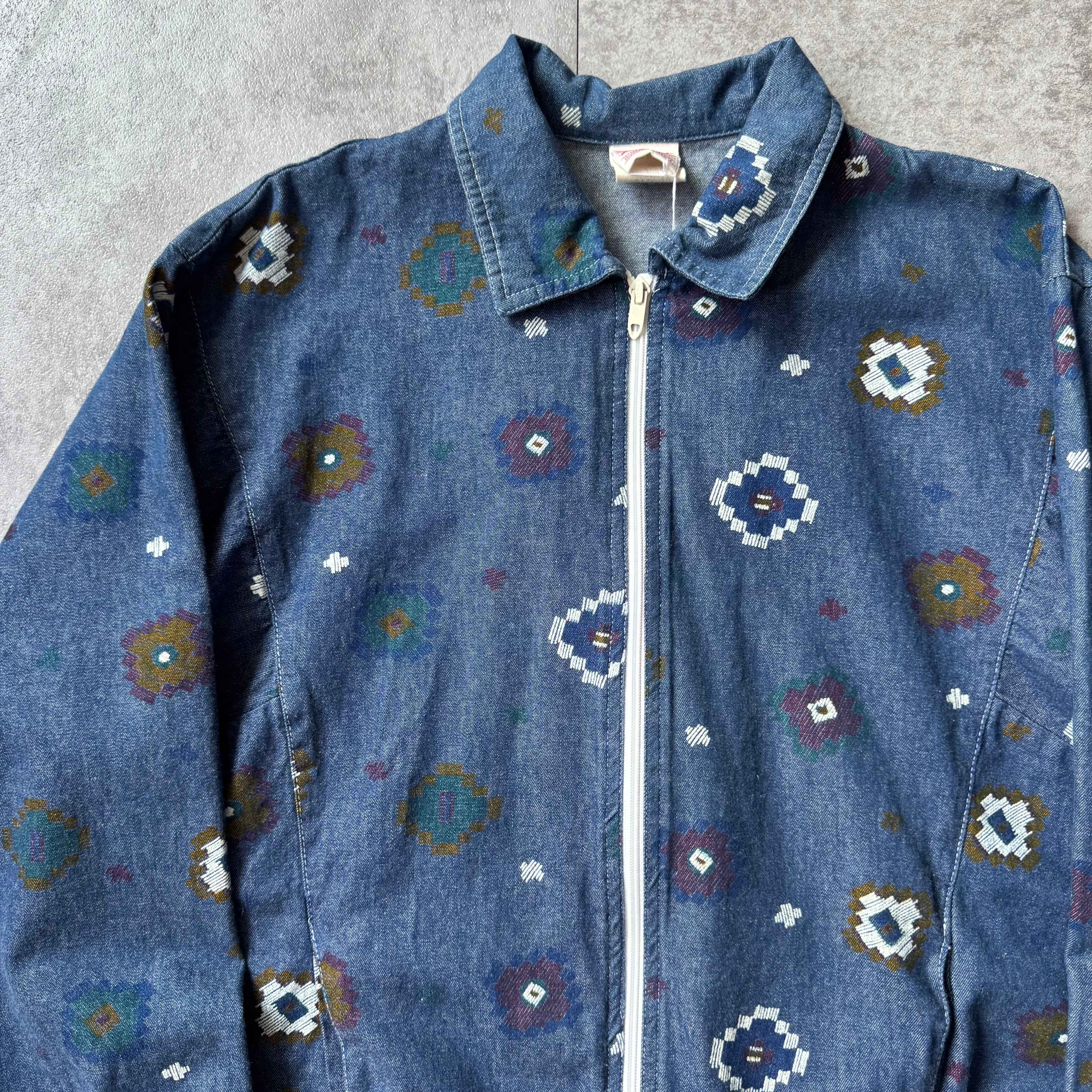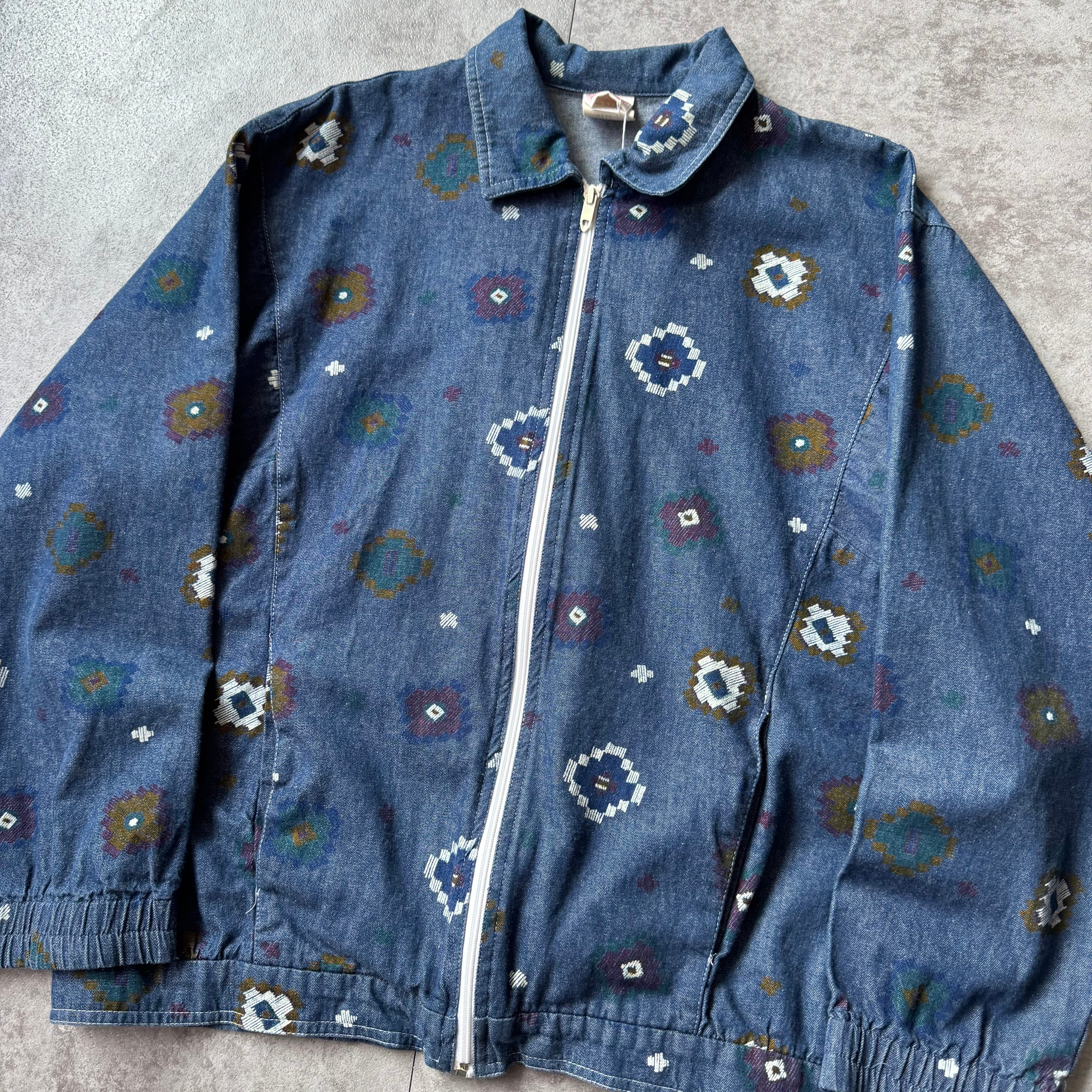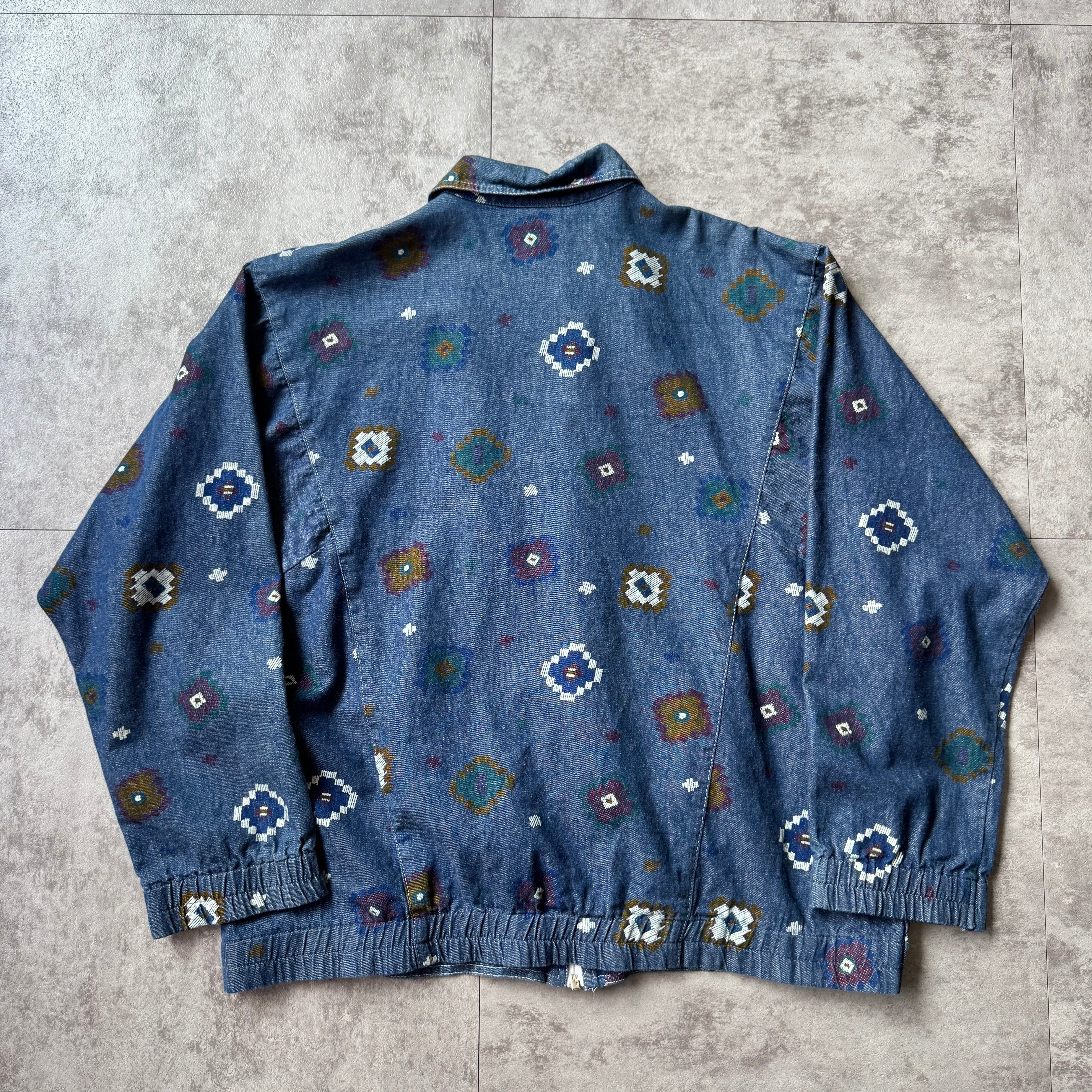 一枚地のやや古いデニム地にフラワーの総柄プリント。