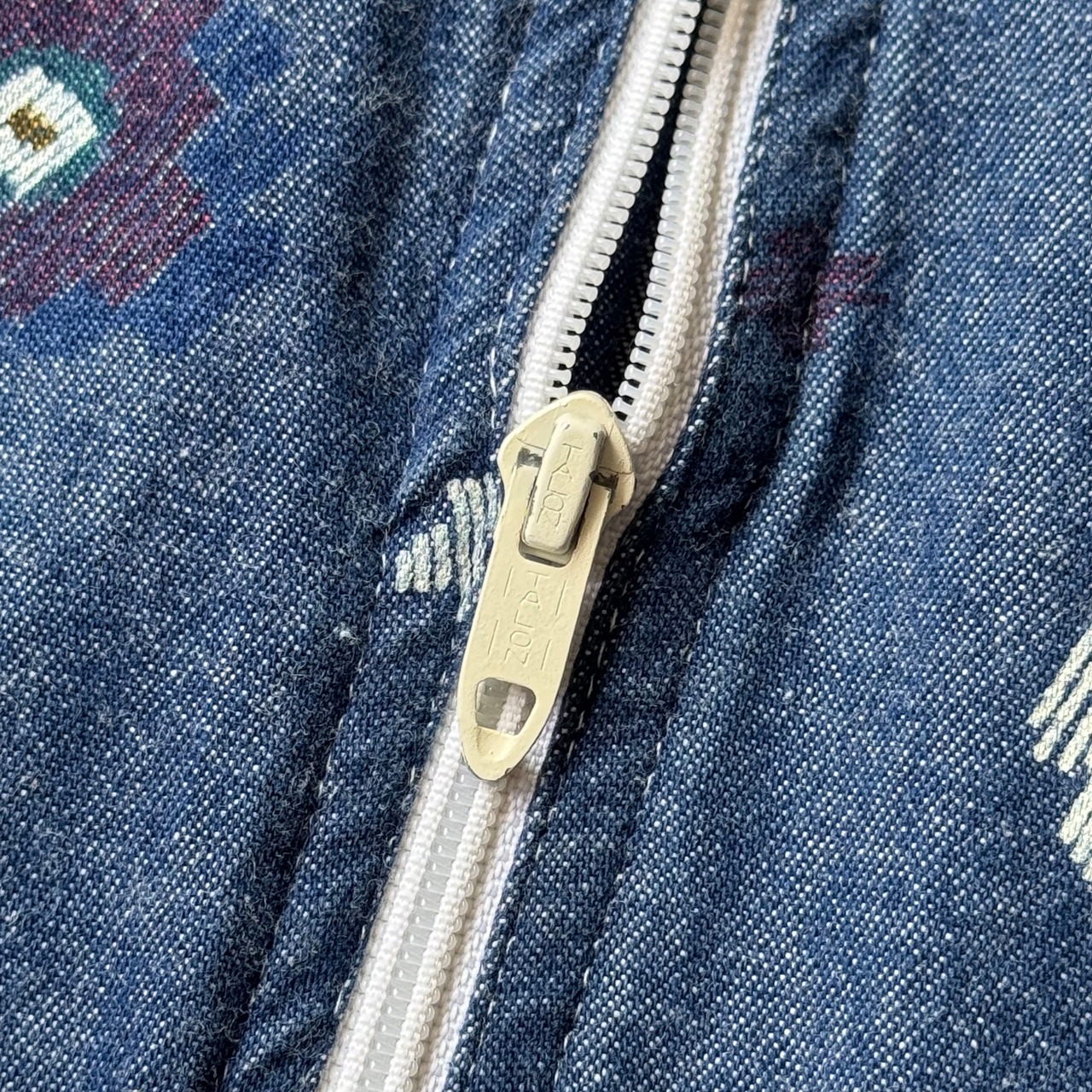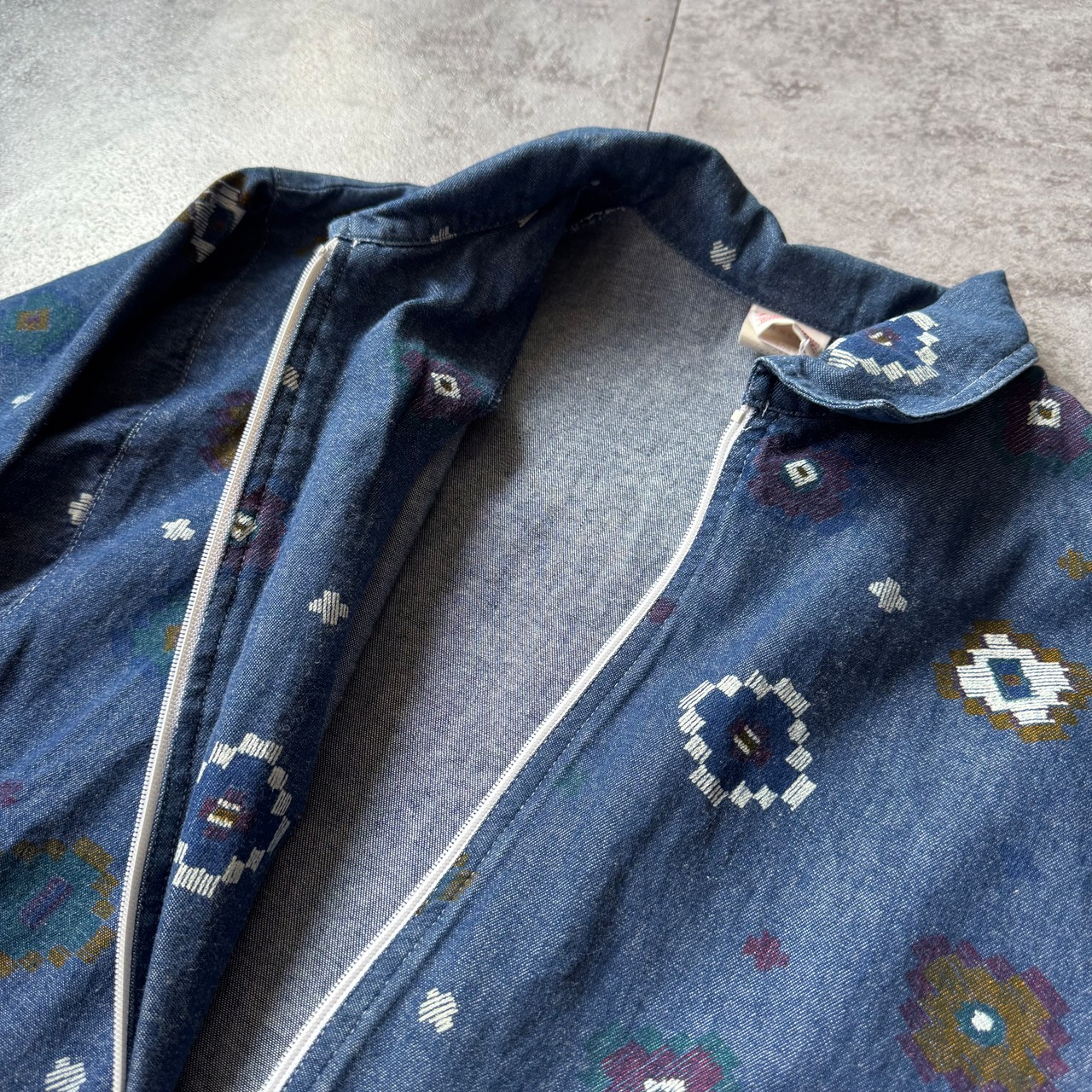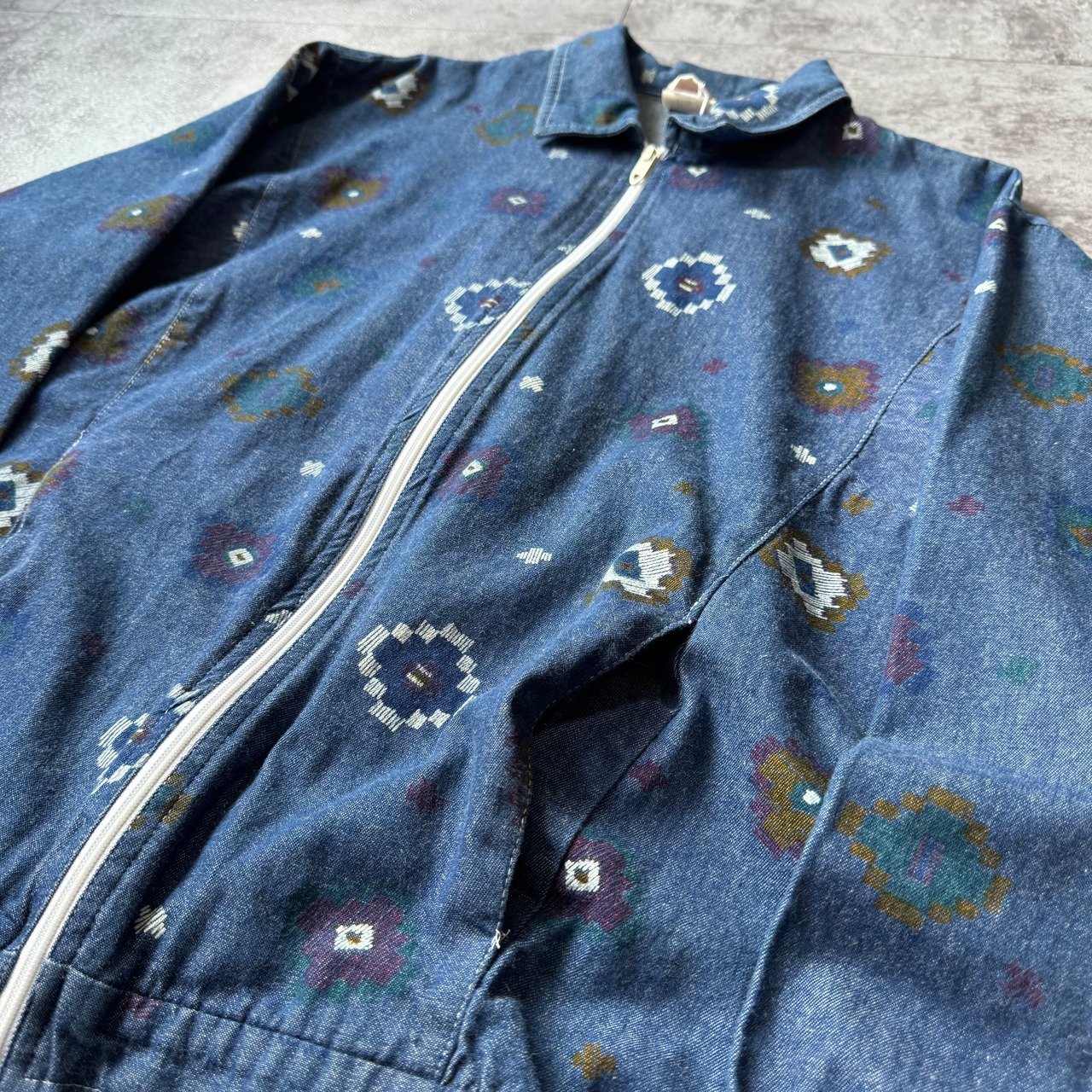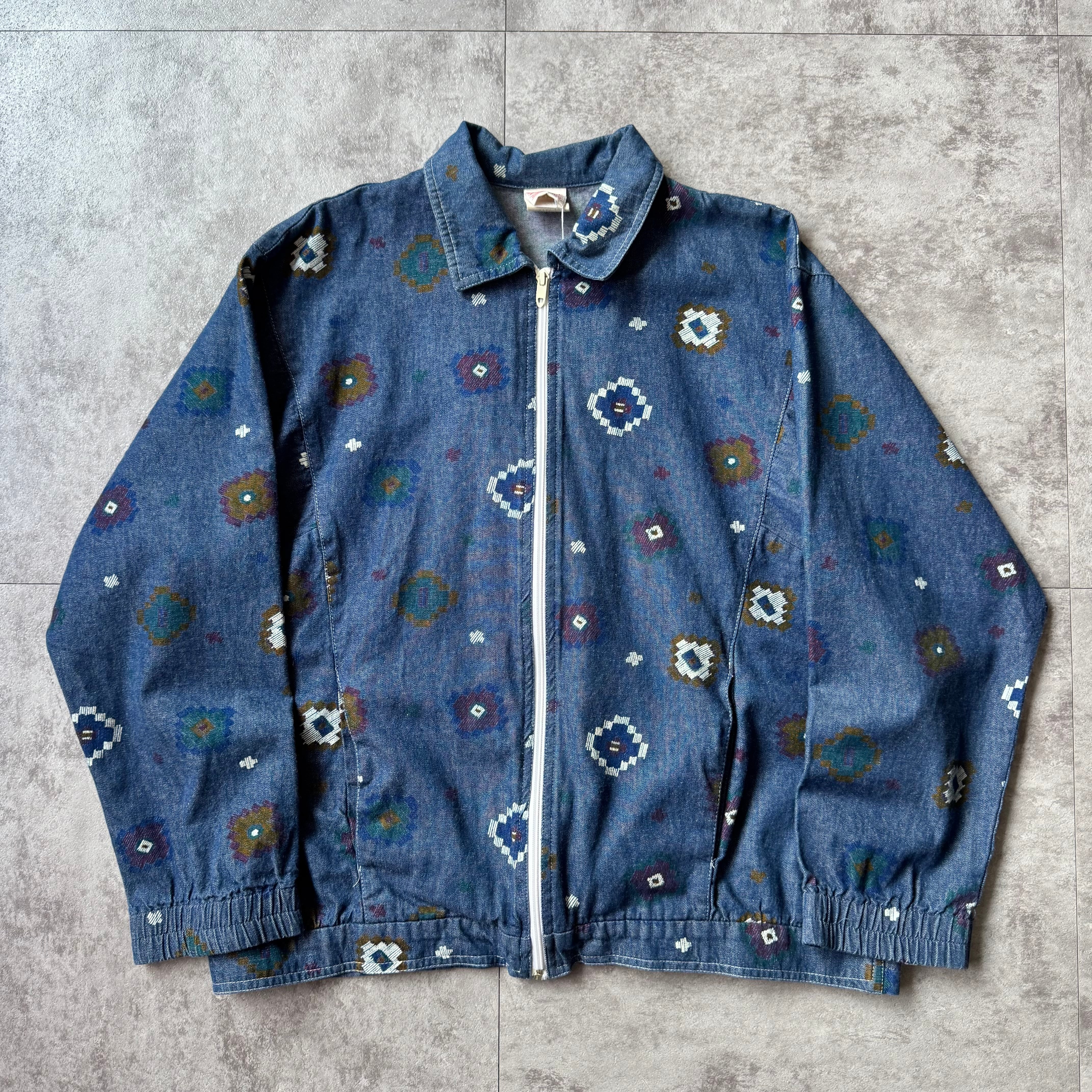 一枚地のやや古いデニム地にフラワーの総柄プリント。